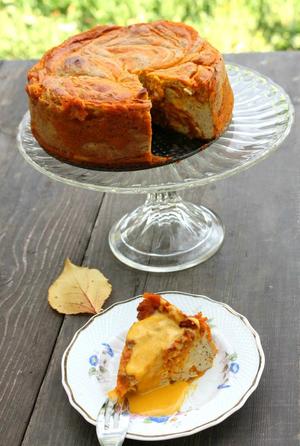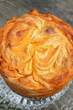 -> Egy kb. 20 cm átmérőjű tortaformát kenj ki olajjal, szórd meg egy kicsit liszttel. A tofus és sütőtökös krémet egy kanállal rétegezd a formába. A rétegezést középen kezdeményezd, először a sütőtökös krémmel, aztán mehet mellé a tofus krém és így tovább felváltva szépséges kör alakban. Ne úgy, ahogy én :)